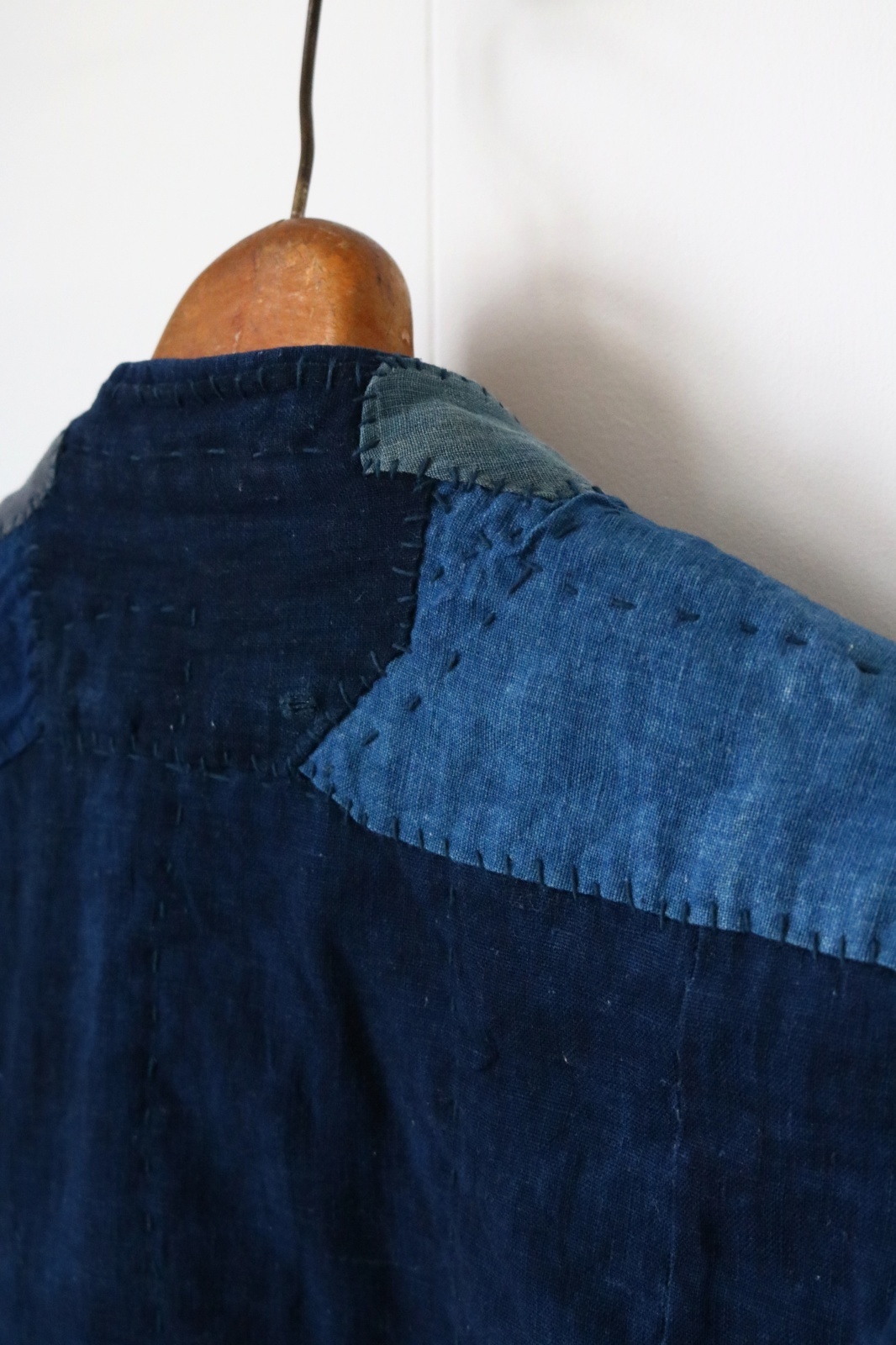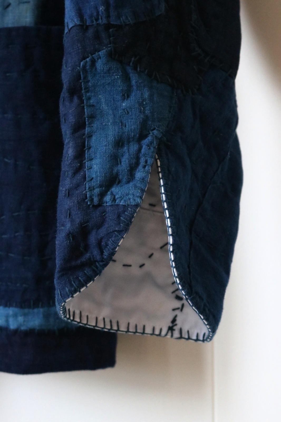 古い藍染木綿を全体的に手縫いで当て布し、元々白のシャフジャケットを藍染のジャケットに生まれ変わりました。